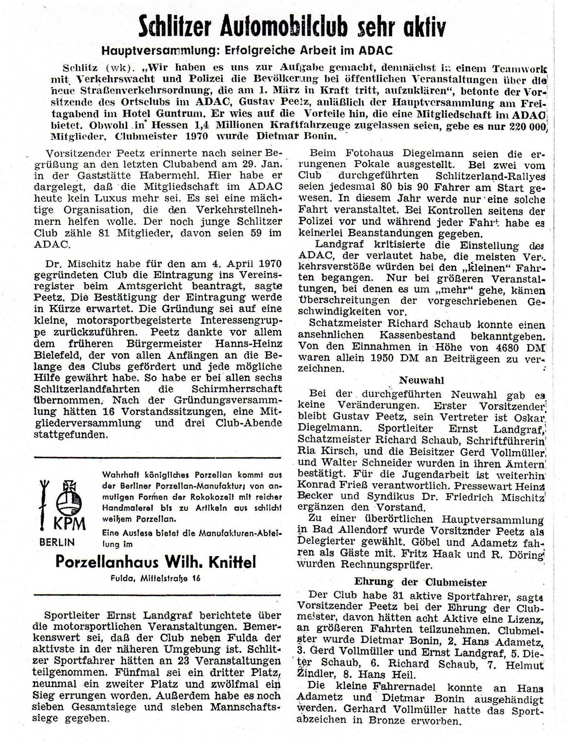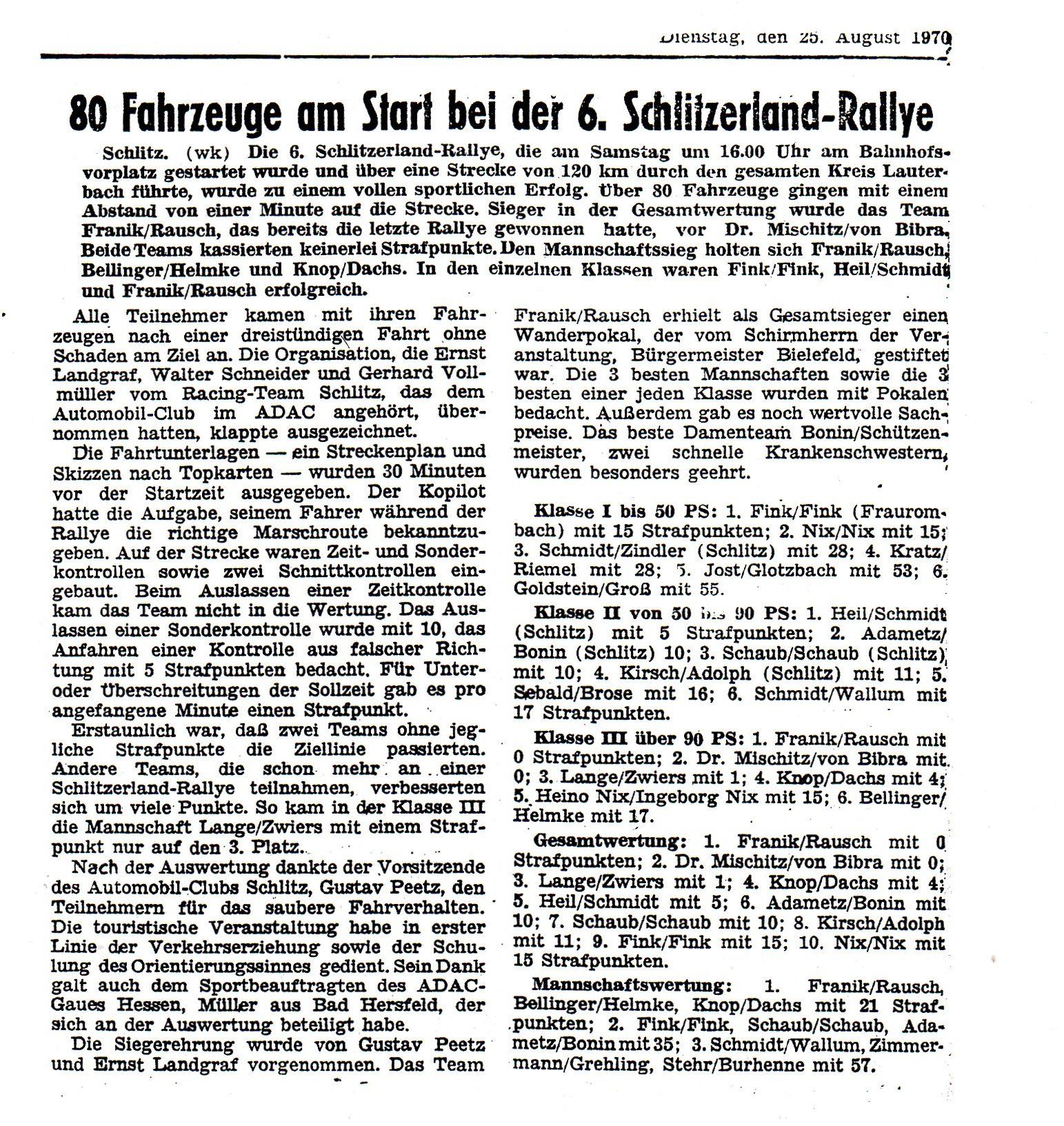 Unten der Pressebericht zur 6. Schlitzerland-Rallye im August 1970