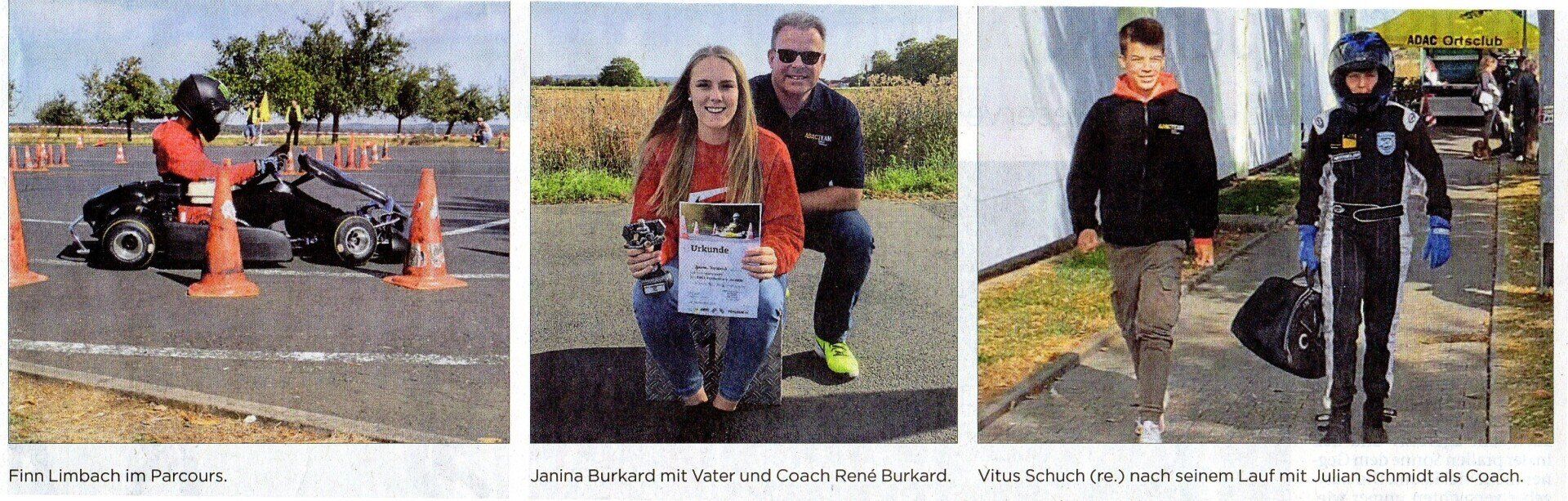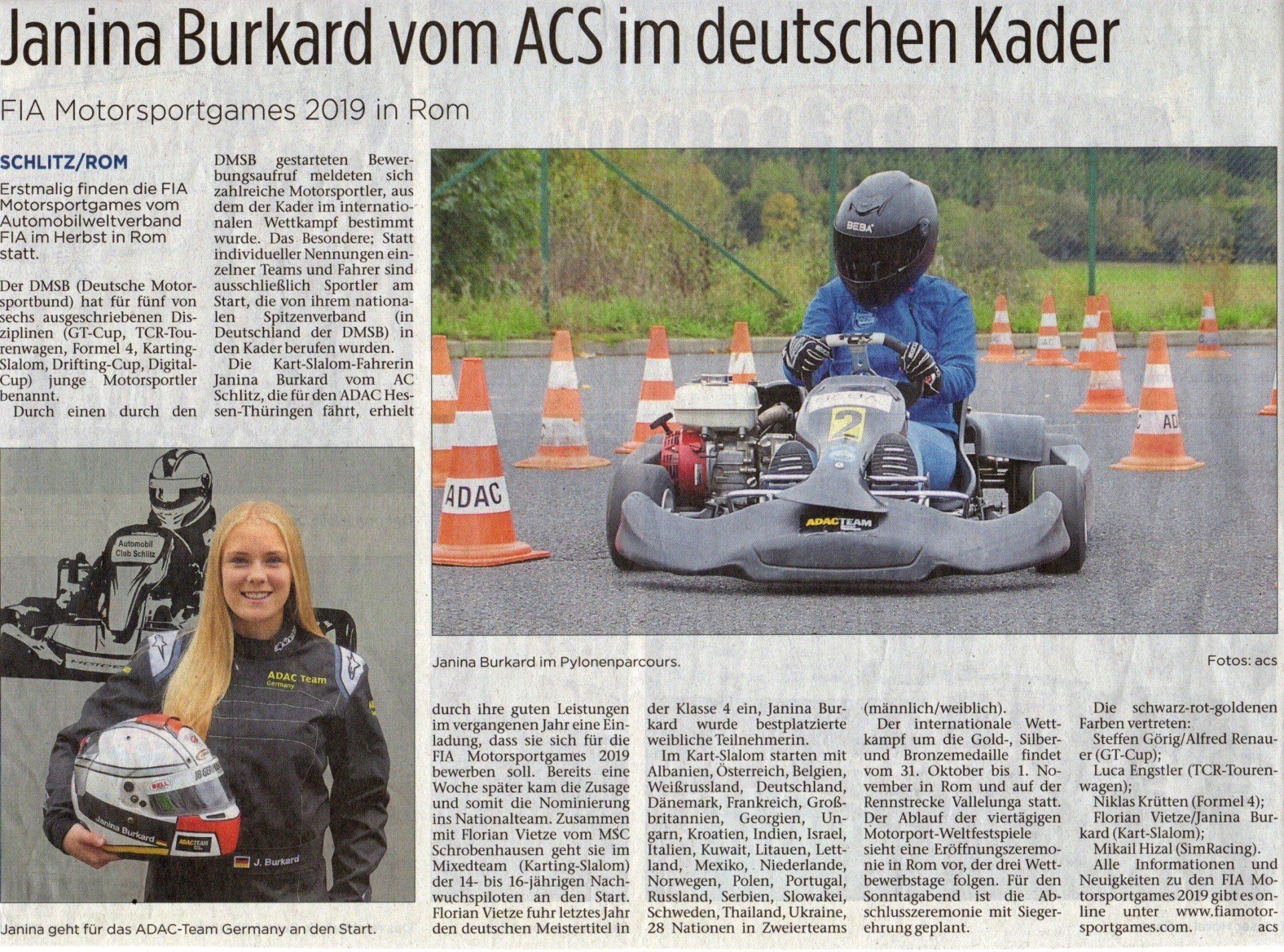 Jede von den 28 teilnehmenden Nationen stellte ein Team aus einem männlichen und einem weiblichen Fahrer im Alter von 14-16 Jahren, die gemeinsam gewertet wurden. Im Viertelfinale startete Deutschland gegen Portugal. Hier war Janina Burkard etwas vom Pech verfolgt. Der über Nacht und am Morgen noch andauernde Regen setzte unverhofft zu ihrer Startzeit aus, worauf entschieden wurde mit Slicks (profillose Reifen) zu fahren. Zum Probelauf setze allerdings der Regen erneut ein. Die jetzt profillosen Reifen waren den Wetterbedingungen nicht gewachsen und brachten einige Pylonenfehler in die Wertung. Nach Janinas vier Wertungsläufen und Florians zwei Läufen lag das Team Deutschland mit 0,35 Sekunden knapp vorne. Dieser Vorsprung reichte aber letztendlich für die letzten beiden entscheidenden Läufe nicht aus. Burkard und Vietze mussten sich mit dem hauchdünnen Rückstand von 0,731 Sekunden geschlagen geben und beendeten die Motorsportgames 2019 auf dem 5. Platz.