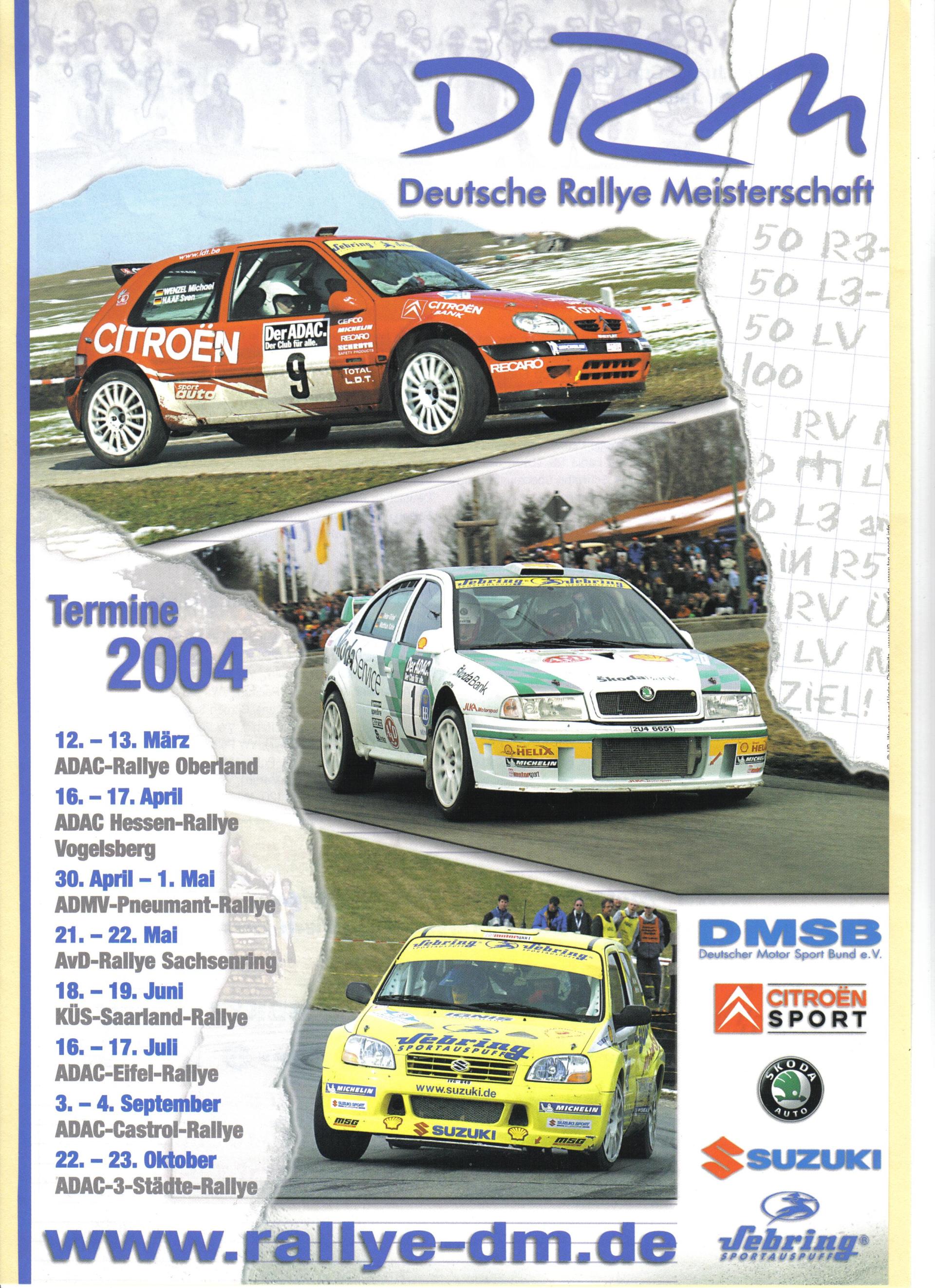 April 2004. Mit der ADAC Hessen-Rallye Vogelsberg knüpft die oberste Rallye-Liga DRM an historische Zeiten an. Erinnerungen an das Rallye-Highlight der 70er und 80er Jahre werden wach. Prominentester Zaungast war Weltmeister Walter Röhrl beim Rundkurs in Willofs unter Flutlicht und dem legendären Schottenring. Gesamtsieger wurden Kahle/Göbel mit ihrem Skoda Oktavia WRC.
